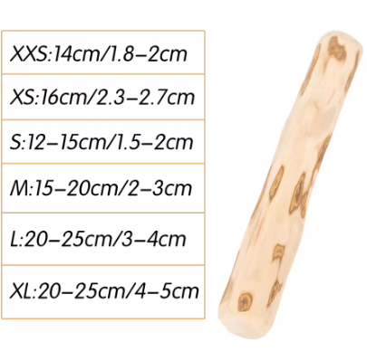 Fabricado con madera natural segura, este mordedor satisface la necesidad natural de masticar, ayudando a reducir ansiedad, aburrimiento y conductas destructivas, mientras limpia los dientes de forma mecánica.